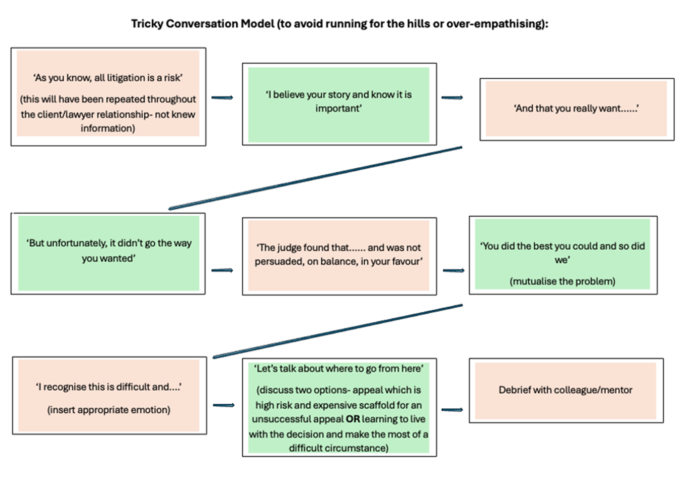 “Here, you might say, ‘But unfortunately, it didn’t go your way…’ before detailing, with clear and unambiguous language, the outcome of the judgment,” Robert says. “At this stage, you can expect a client can really start to get emotionally dysregulated.”
